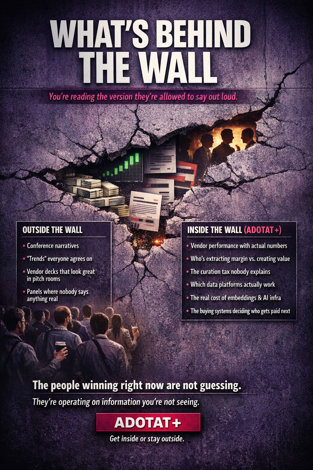 The first-party data activation platforms worth evaluating right now versus the ones with beautiful pitch decks and no production customers. The embeddings vendors delivering those 40 to 70% CTR lifts and what implementation actually costs. The agentic buying infrastructure being built right now that will determine which publishers get spend and which ones get skipped entirely. The wrapper technology decisions that look tactical and are actually strategic. We talked to dozens of people across this ecosystem who told us things they would not say on a panel. That intelligence is in ADOTAT+.