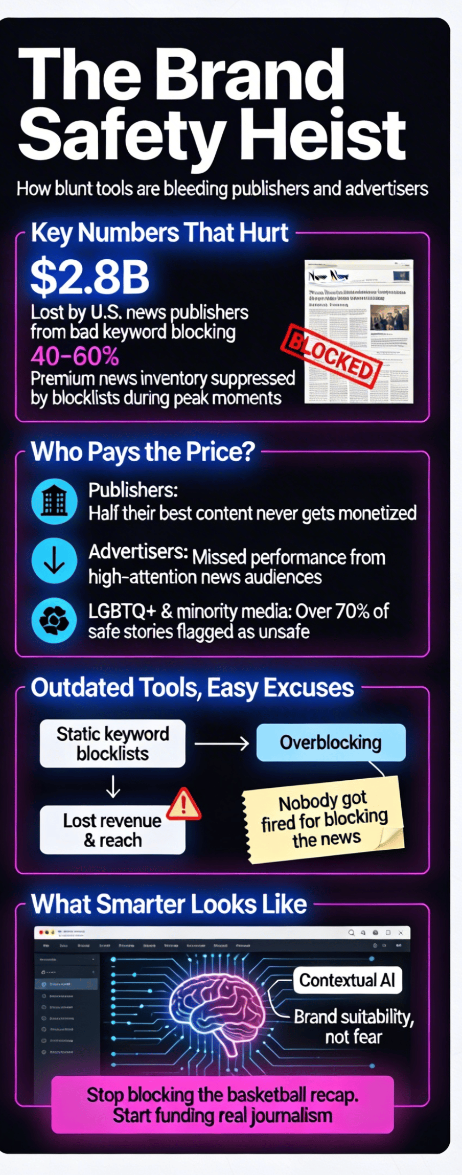 Here is how this works for anyone who has somehow avoided this particular circle of hell: traditional keyword blocklists scan page text for words like "shoot," "shot," "kill," "attack," "victims," "injuries" and automatically suppress ads on any page where they appear. Sounds reasonable until you realize that "a blocked shot by LeBron James," "victims of a second-quarter collapse," and "attack on the basket" are now classified alongside actual crime reporting by an algorithm that has the contextual sophistication of a golden retriever reading Shakespeare.