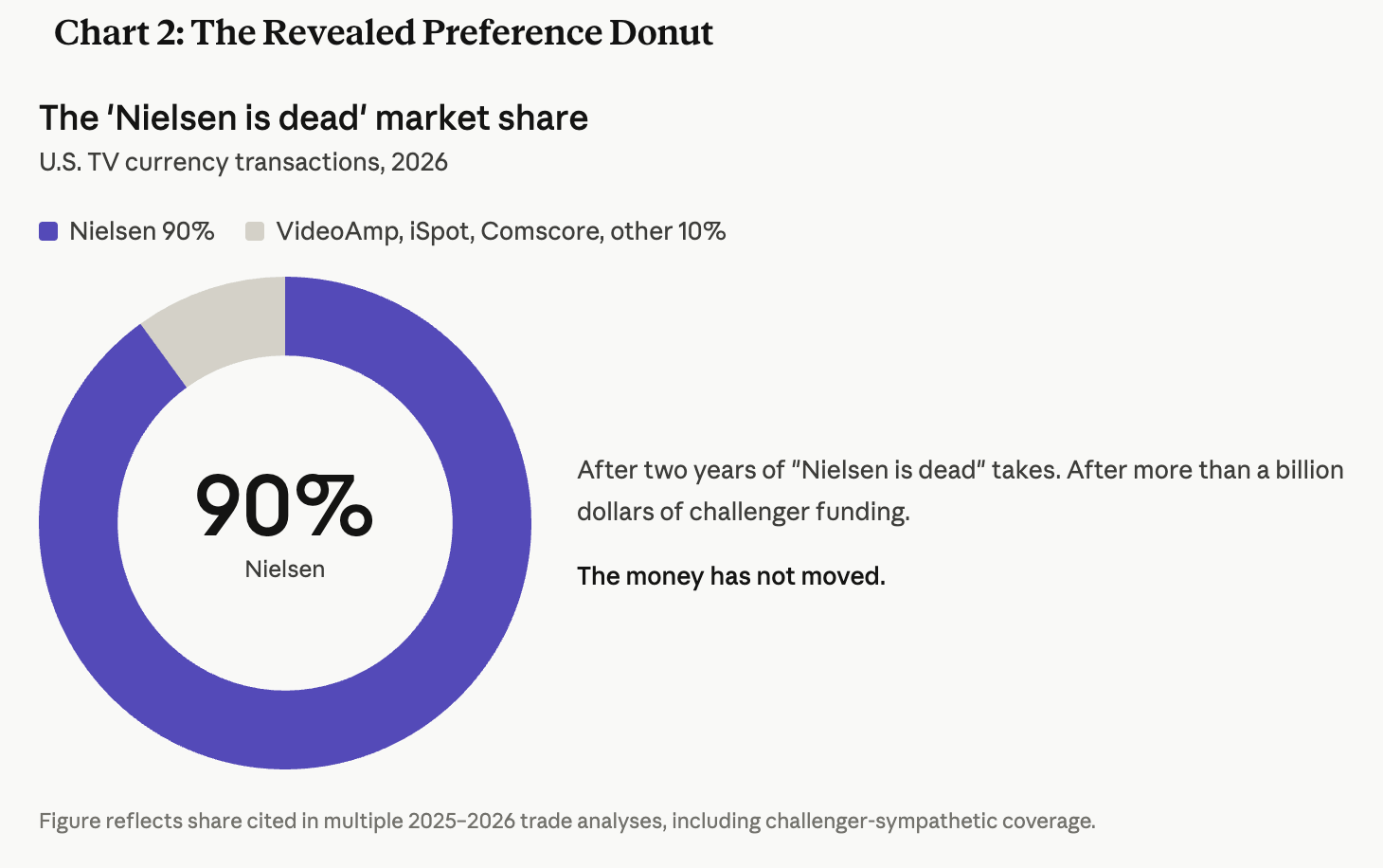 But "Nielsen has real work to do" and "Nielsen is obsolete and about to be replaced" are two completely different sentences. The trade press keeps publishing the second one while the evidence, the accreditations, the contracts, the Netflix-MLB deal, the NFL and Fox Sports endorsements, the 80-to-90-percent share, and the spectacle of a challenger chairman conceding under 1% of the TAM, all point overwhelmingly to the first.