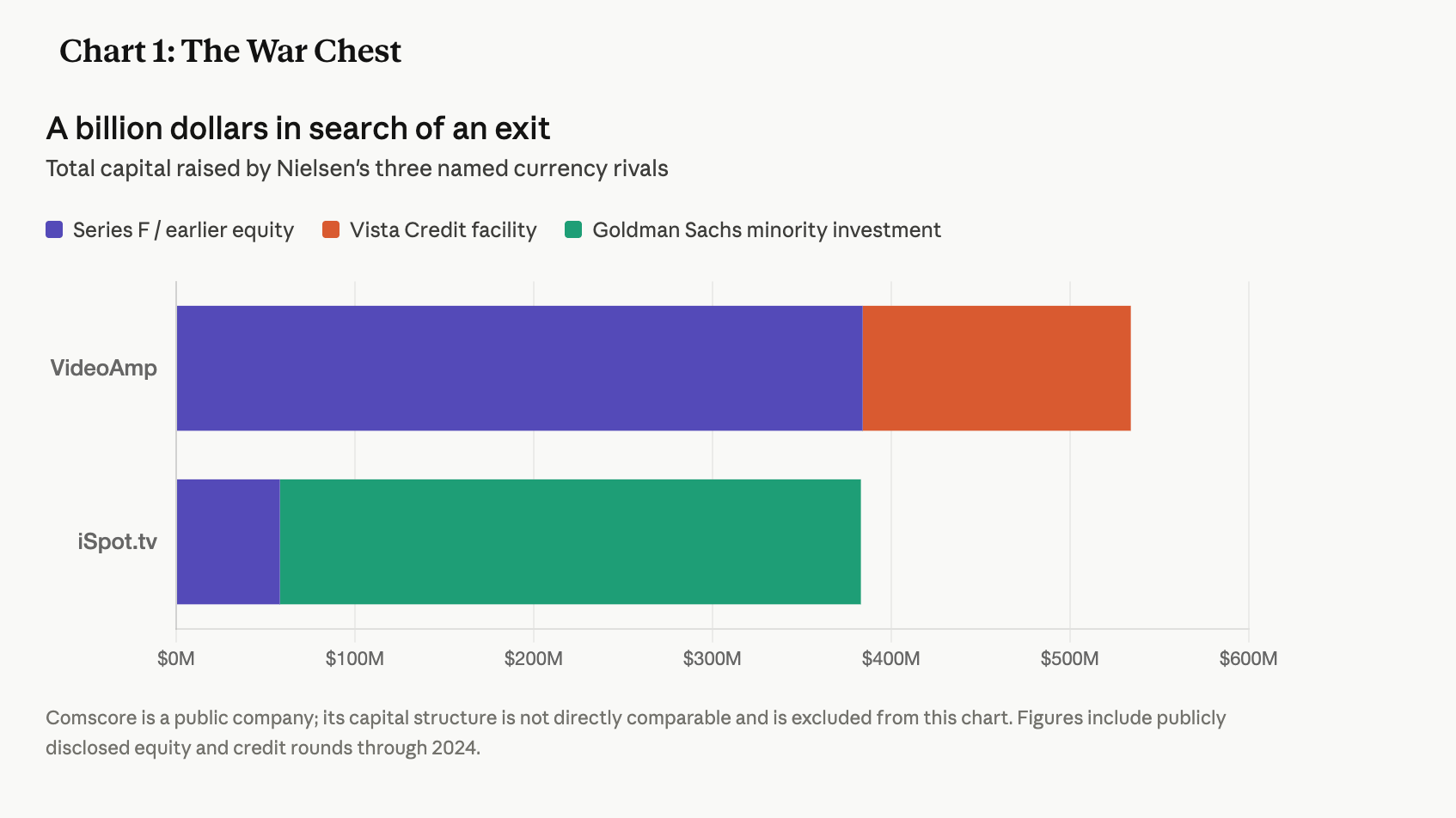 VideoAmp raised a $275 million Series F in October 2021 at a valuation somewhere around $1.1 to $1.4 billion. Then a $150 million round led by Vista Credit Partners in late 2023. Plus earlier rounds. The cap table reads like a guest list at a Hamptons fundraiser: Tiger Global. Spruce House Partnership. D1 Capital. Ankona Capital. EPIQ Capital. Vista. Vista Credit, by the way, is not in the business of funding methodology debates for the love of the game. Vista Credit is in the business of financing enterprise technology and generating returns for limited partners on a clock. The clock is ticking. Has been since 2023.