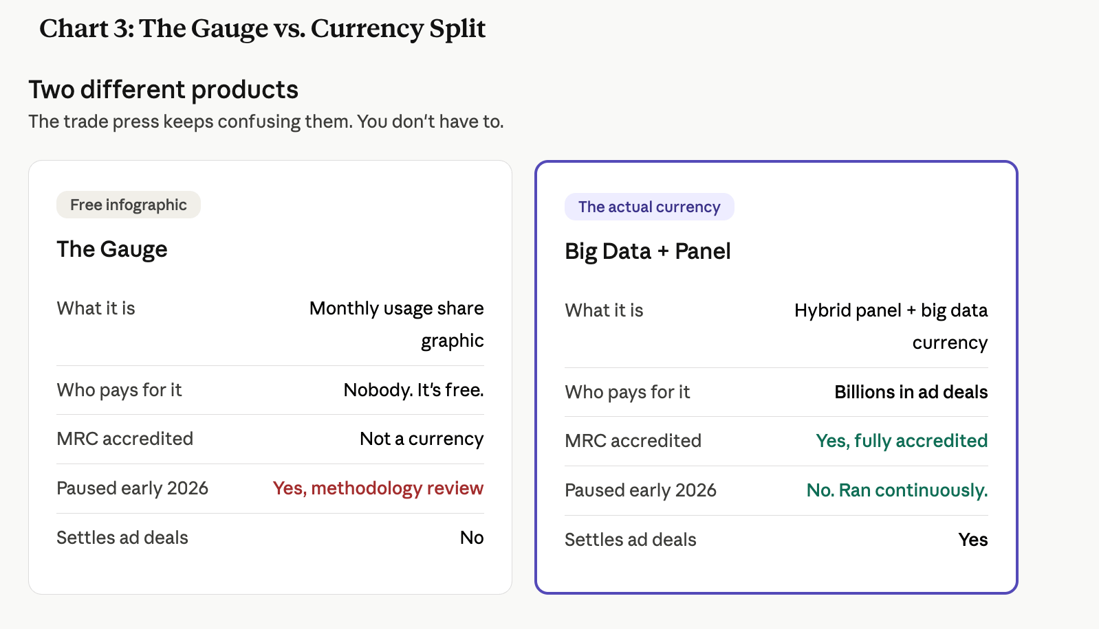 When Nielsen paused methodology changes to the Gauge earlier this year, the currency ratings never stopped. Not for a day. Not for an hour. Every dollar of advertising transacted in that window transacted on Big Data + Panel, exactly as before. The Gauge pause was about a free marketing graphic.
