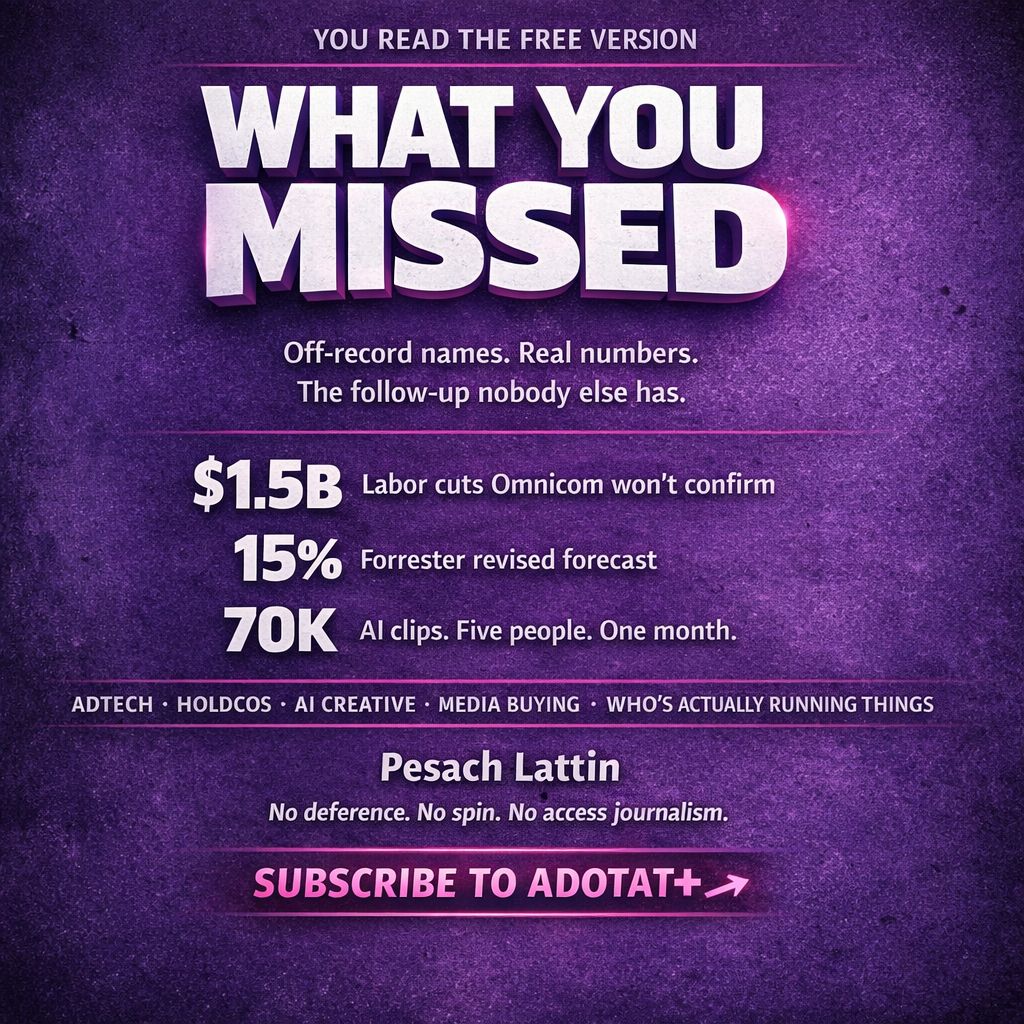 The stuff nobody will print. The junior pipeline data by agency. The real reason Meta's Advantage+ replaced your best ad with an AI grandmother without asking. The adtech deals that explain why your brand safety problem is worse than any vendor will tell you it is.